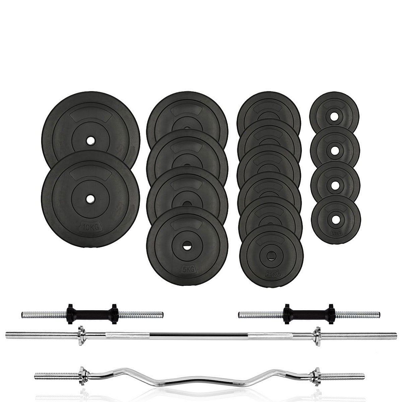 У комплект входить гриф прямою довжиною 180 см, діаметром 30 мм, гриф W-подібний, дві гантелі одноручні довжиною 45 см з діаметром 30 мм та диски. Загальна вага складає 80 кг.