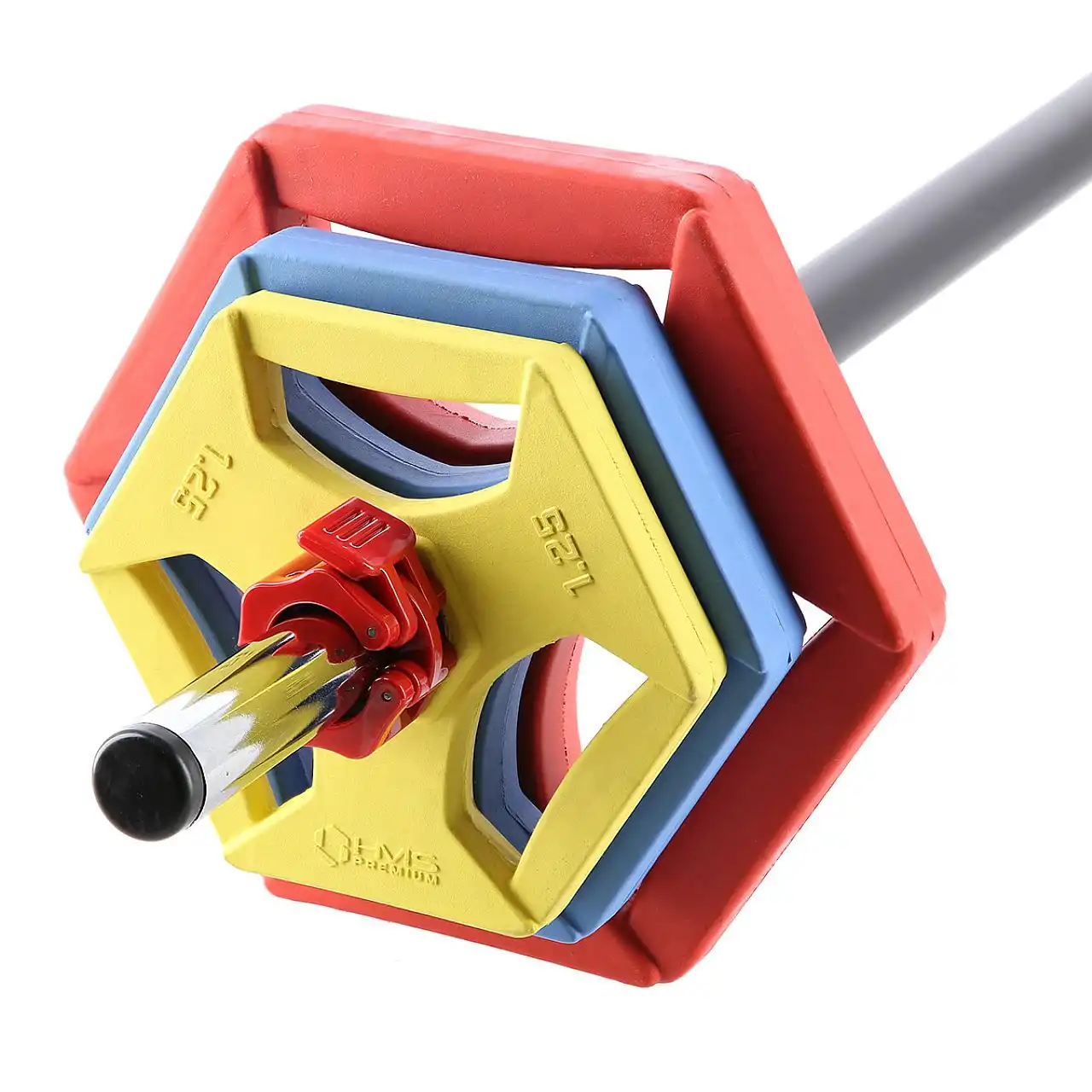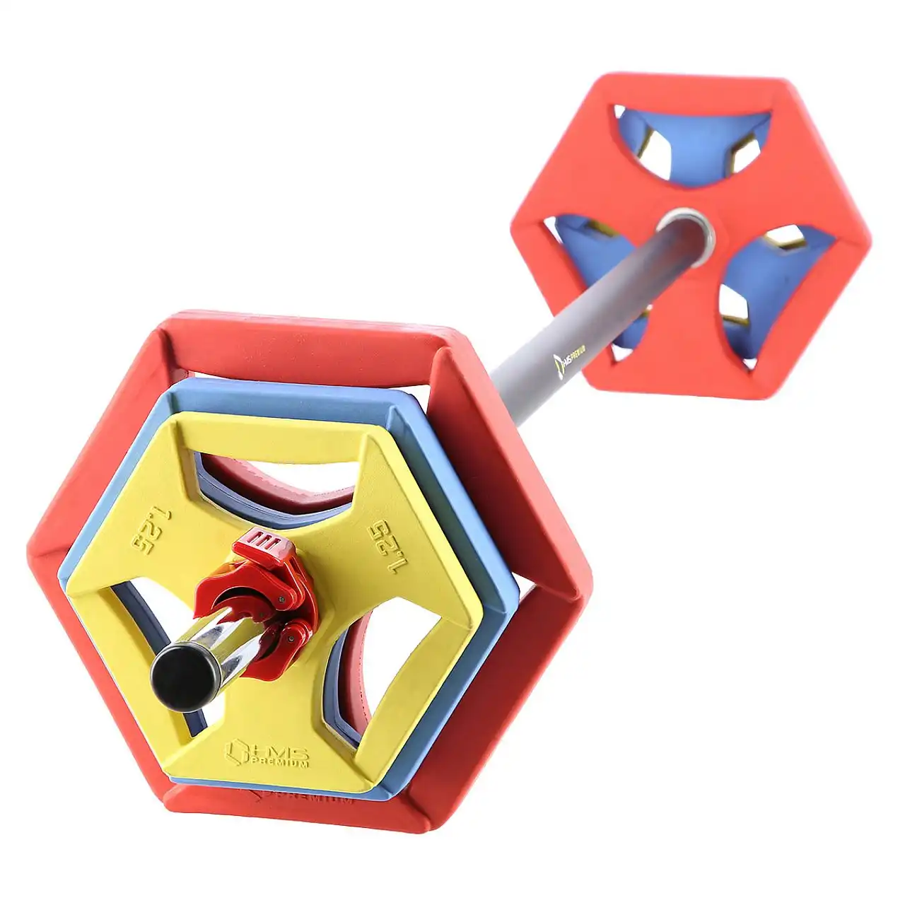 Горловина і пластини виготовлені з високоякісного чавуну, що забезпечує виняткову довговічність виробу. Горловина покрита приємною на дотик піною, завдяки чому вона добре лежить в руці, не ковзає під час занять, запобігає появі слідів від тиску та потертостей. Пластини покриті кольоровою гумою, кожен колір відповідає різному навантаженню. Він поглинає будь-який удар - штанга, впущена на землю, не пошкоджує землю і не пошкоджується сама. Важливо, що пластини мають шестикутну форму, яка оптимальна для фітнес-вправ, оскільки після відкладання або викидання штанги запобігає її неконтрольоване відкочування. Затискачі, що входять в комплект, дозволяють правильно притискати пластини і утримувати їх на місці незалежно від виконуваної вправи.