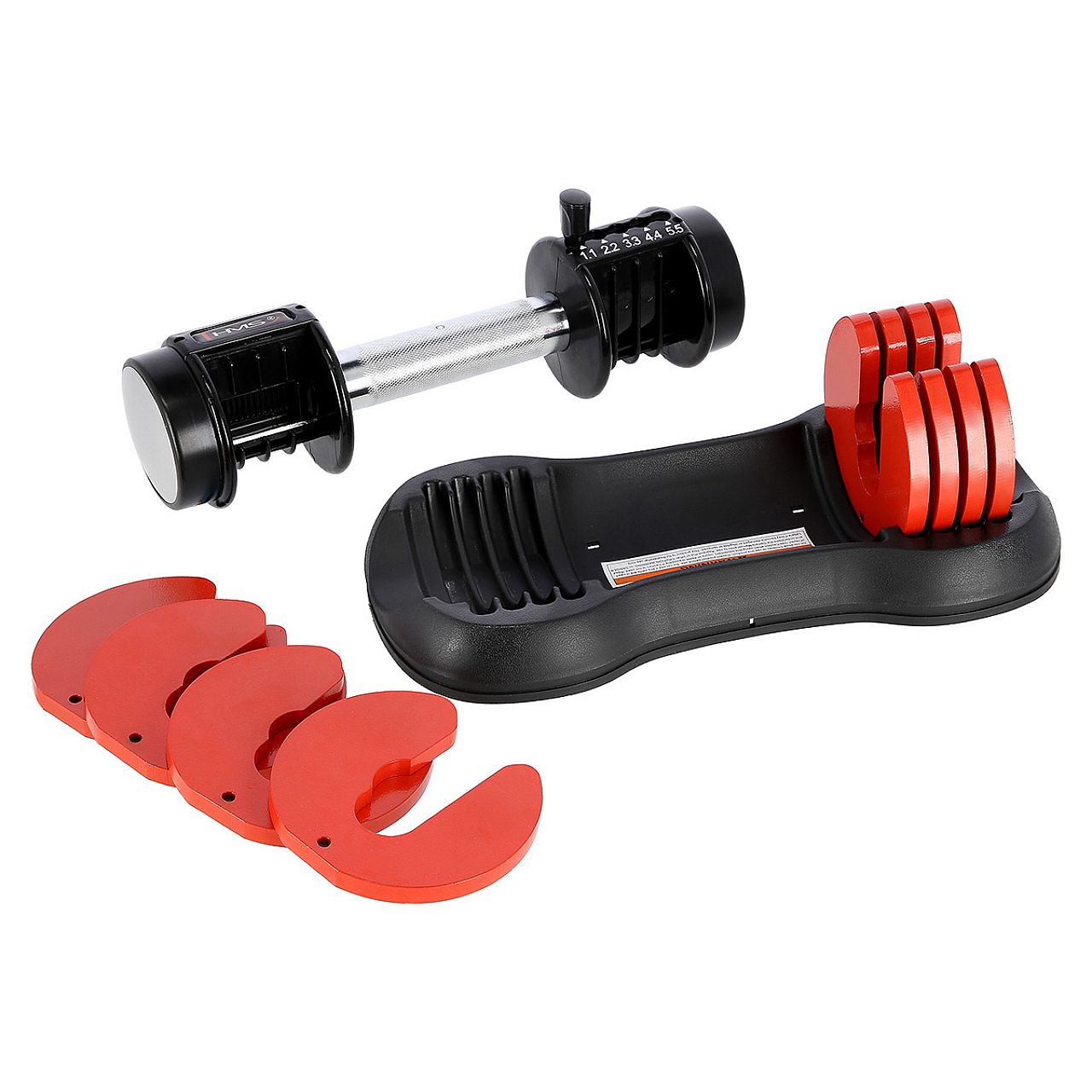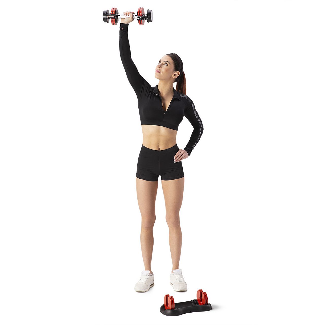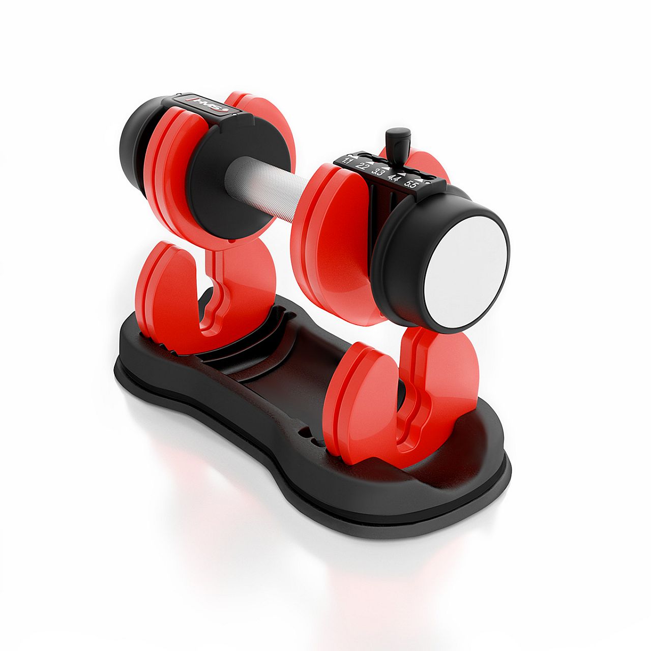 У набір входить гантель, 8 дисків та основа-підставка. Продукт є ідеальним рішенням для людей, які займаються вдома, але він добре працюватиме в тренажерному залі, замінюючи цілий гантельний ряд з традиційними гантелями.