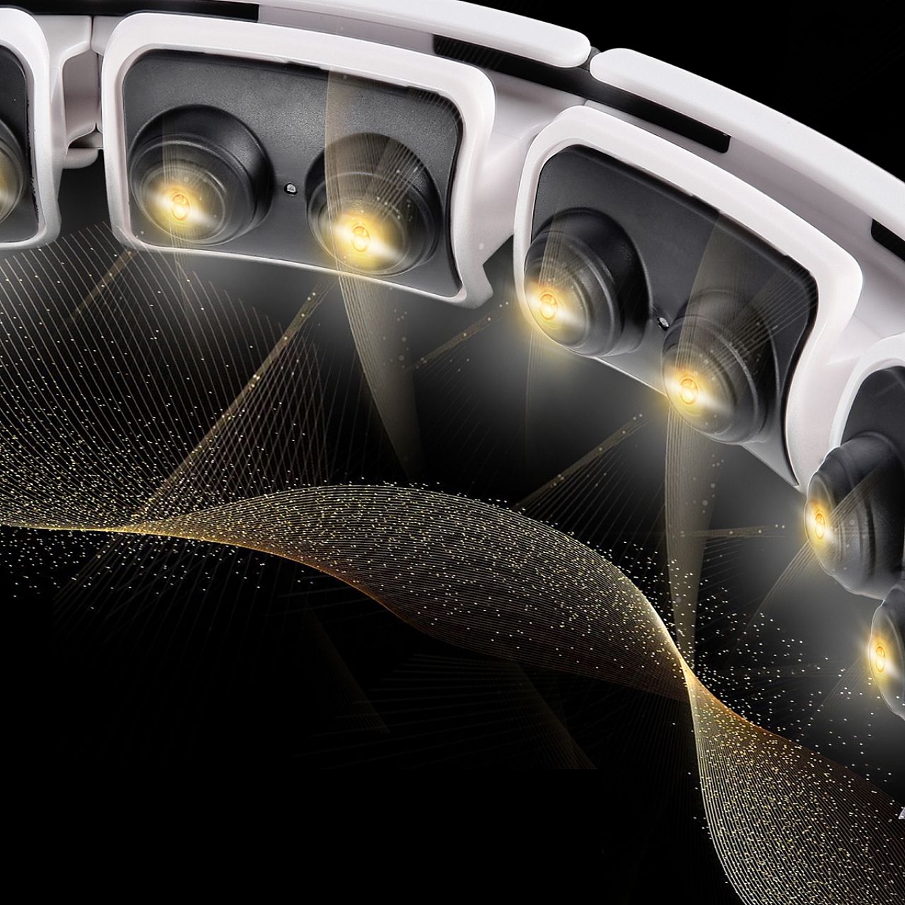 Завдяки руху на 360 градусів пружини, розташовані в головках, розташованих по всій окружності петлі, відмінно поглинають перевантаження і підлаштовуються під тіло, що створює додатковий масажний ефект, забезпечуючи тілу приємні відчуття. Техніка тривимірного масажу швидко стимулює м'язи. Вбудовані виступи зі спеціально розробленим зовнішнім виглядом мають амортизацію для комфортного тренування. Відрегулюйте інтенсивність вібрації за допомогою швидкості обертання.
