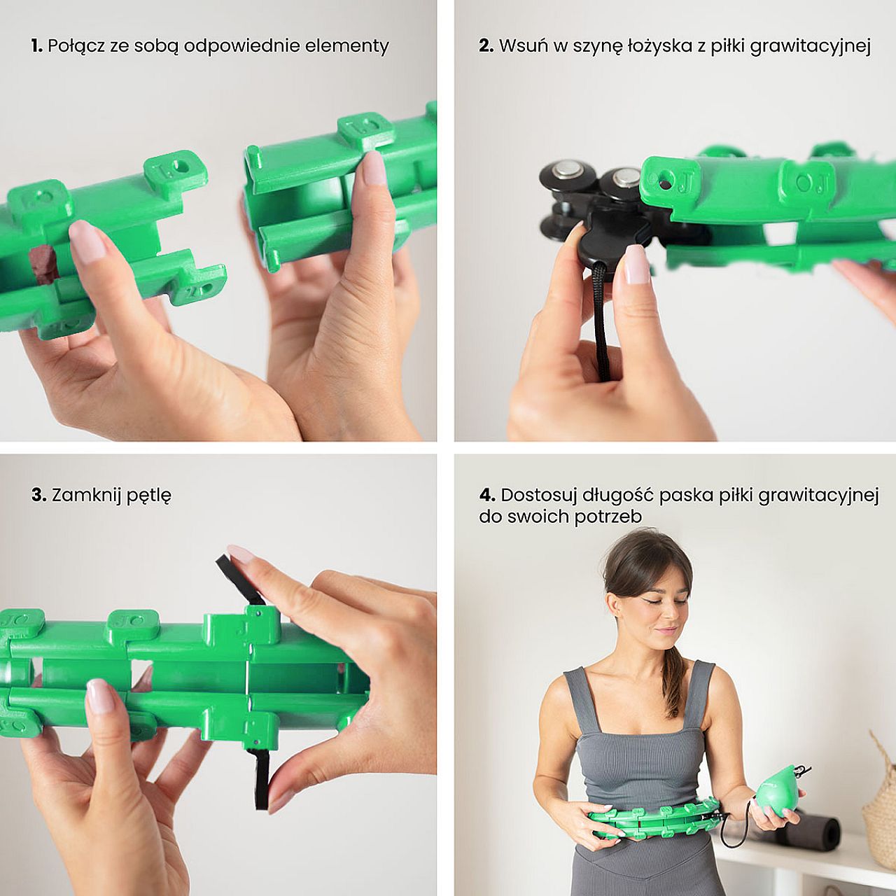 Розкриваємо петлю за допомогою магнітних затискачів. Потім, щоб з'єднати наступні елементи, вставте один елемент в інший так, щоб виступи помістилися у відповідні отвори. При зменшенні елементів візьміть відповідний елемент однією рукою і стисніть так, щоб виступи висунули з отворів. Потім вставте гравітаційну рейку в петлю, закрийте затискачі магнітом, відрегулюйте довжину ремінця і все. Крім того, завдяки компактним розмірам його легко носити з собою, ви можете брати з собою всюди.