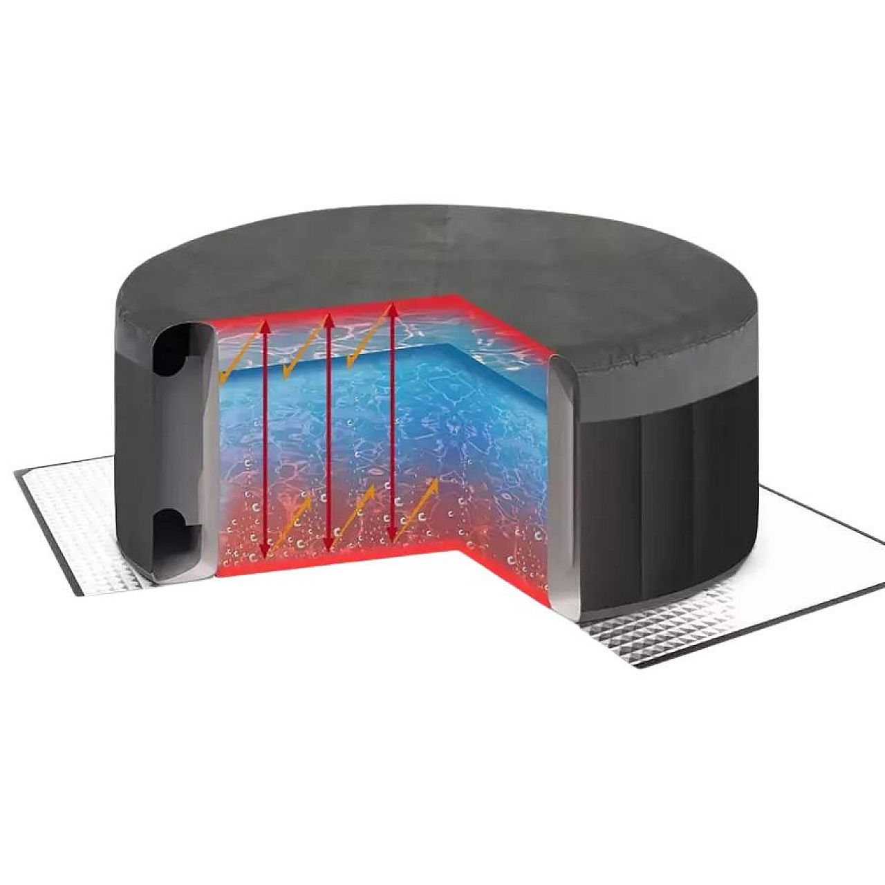 Високоякісний ізоляційний шар із тришарового скловолокна не тільки захищає гідромасажну ванну від пошкодження зовнішньою підлогою, але й запобігає проникненню холоду через матеріал , таким чином довше зберігаючи воду всередині гарячою.