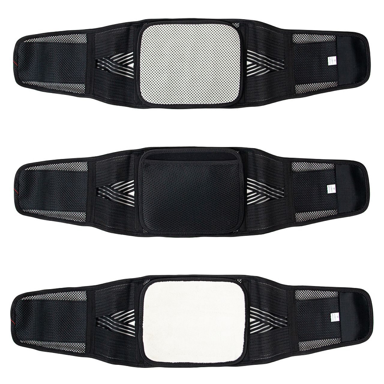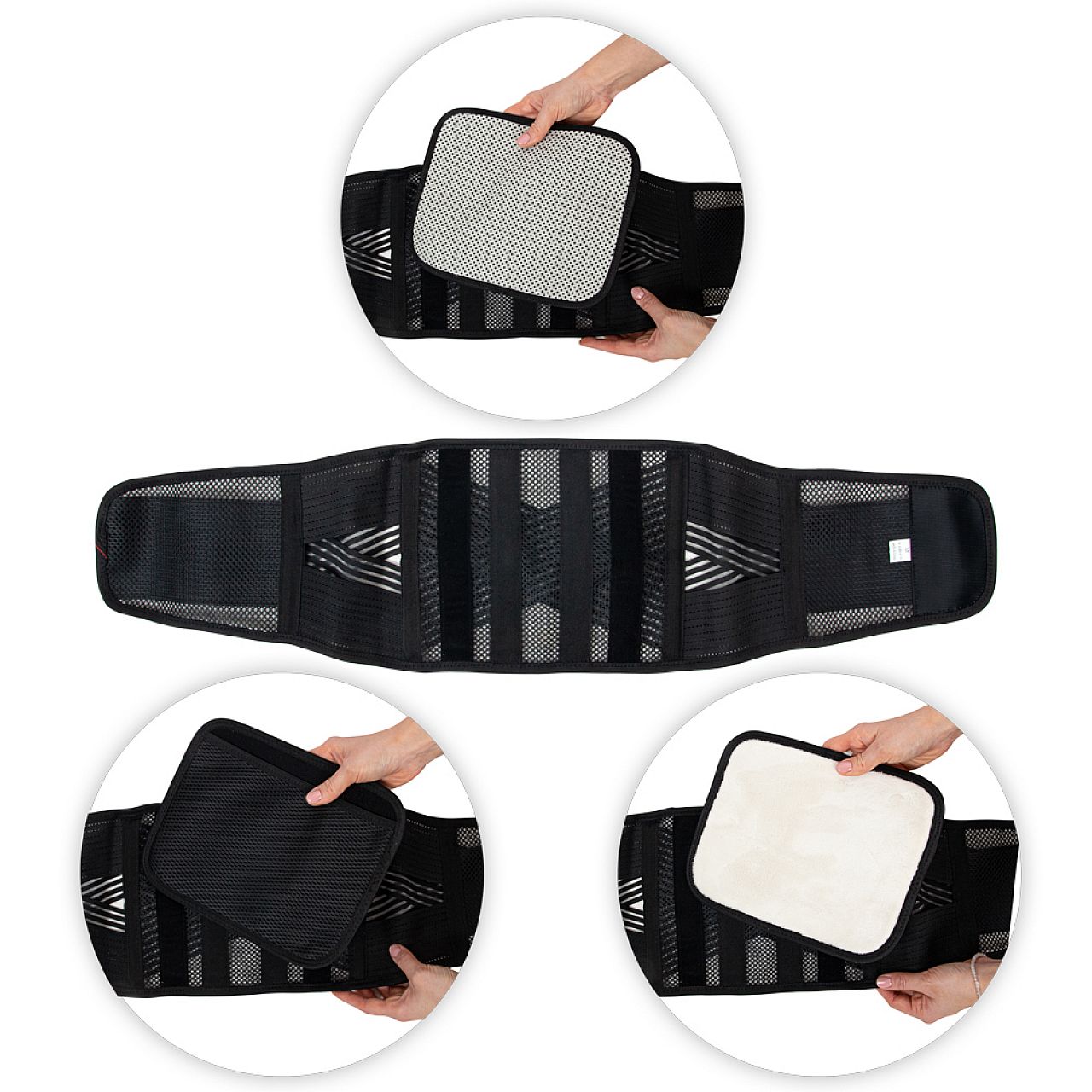 До пояса входять 3 різні вставки – одна з приємною плюшевою поверхнею , одна з кишенею і одна з самонагріваючого матеріалу з турмалінових волокон з магнітами.