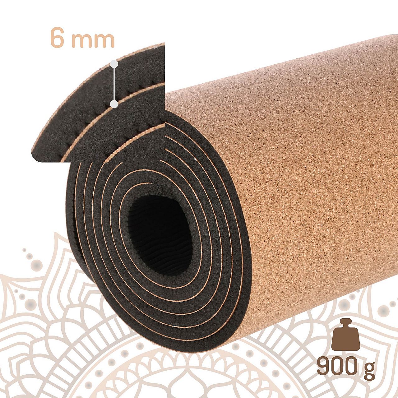 Килимок виготовлений із комбінації матеріалу TPE та пробки для надійності, довговічності та природних антибактеріальних властивостей. TPE, термопластичний еластомер, забезпечує чудове зчеплення, роблячи килимок нековзким і безпечним у використанні. Завдяки своїй еластичності та властивостям пам'яті форми килимок завжди повертається до початкової форми, навіть після інтенсивного використання. Пробка, будучи натуральним матеріалом, приємна на шкіру, гіпоалергенна та екологічно чиста. Крім того, килимок водонепроникний, тому за ним легко доглядати та чистити. Завдяки цим властивостям килимок ідеально підходить як для занять у приміщенні, так і на вулиці.